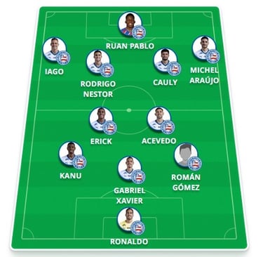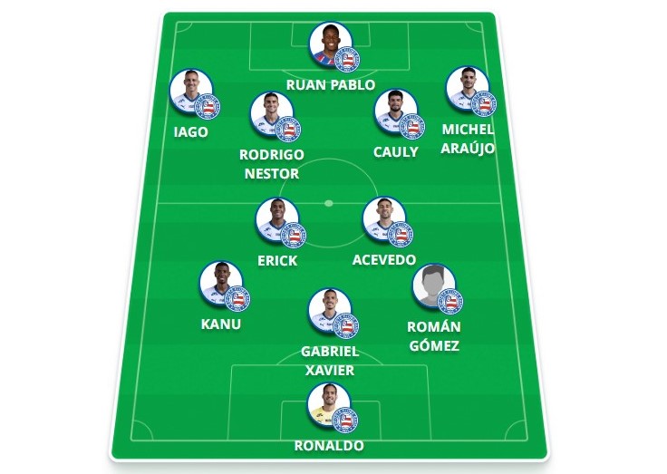 O Bahia iniciou a partida mantendo o modelo de jogo habitual quando tem a posse de bola, com estrutura em 3-2-5. Román Gómez, Gabriel Xavier e Kanu formaram a primeira linha de construção, enquanto Acevedo e Erick deram sustentação ao meio. Mais à frente, Ruan Pablo atuou por dentro com Rodrigo Nestor e Cauly, com Michel Araújo e Iago Borduchi abertos pelos lados.